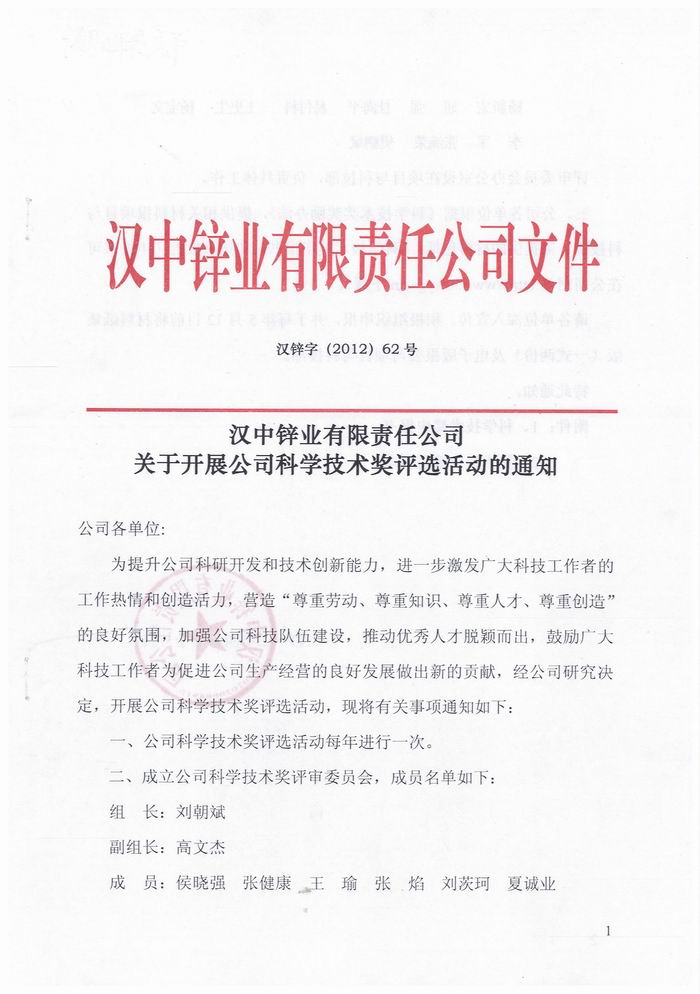 漢中鋅業(yè)公司關(guān)于開展科學(xué)技術(shù)獎(jiǎng)評(píng)選活動(dòng)通知