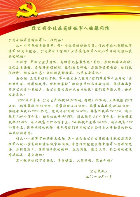 731日按照公司黨政工安排,公司總部、特材公司、銅礦公司同步開展了在崗退伍軍人慰問活動,為他們發放了精美的慰問品和熱情洋溢的慰問信轉達了公司黨政工的深切關愛節日祝福:祝他們節日快樂、身體健康、工作順利、家庭幸福!