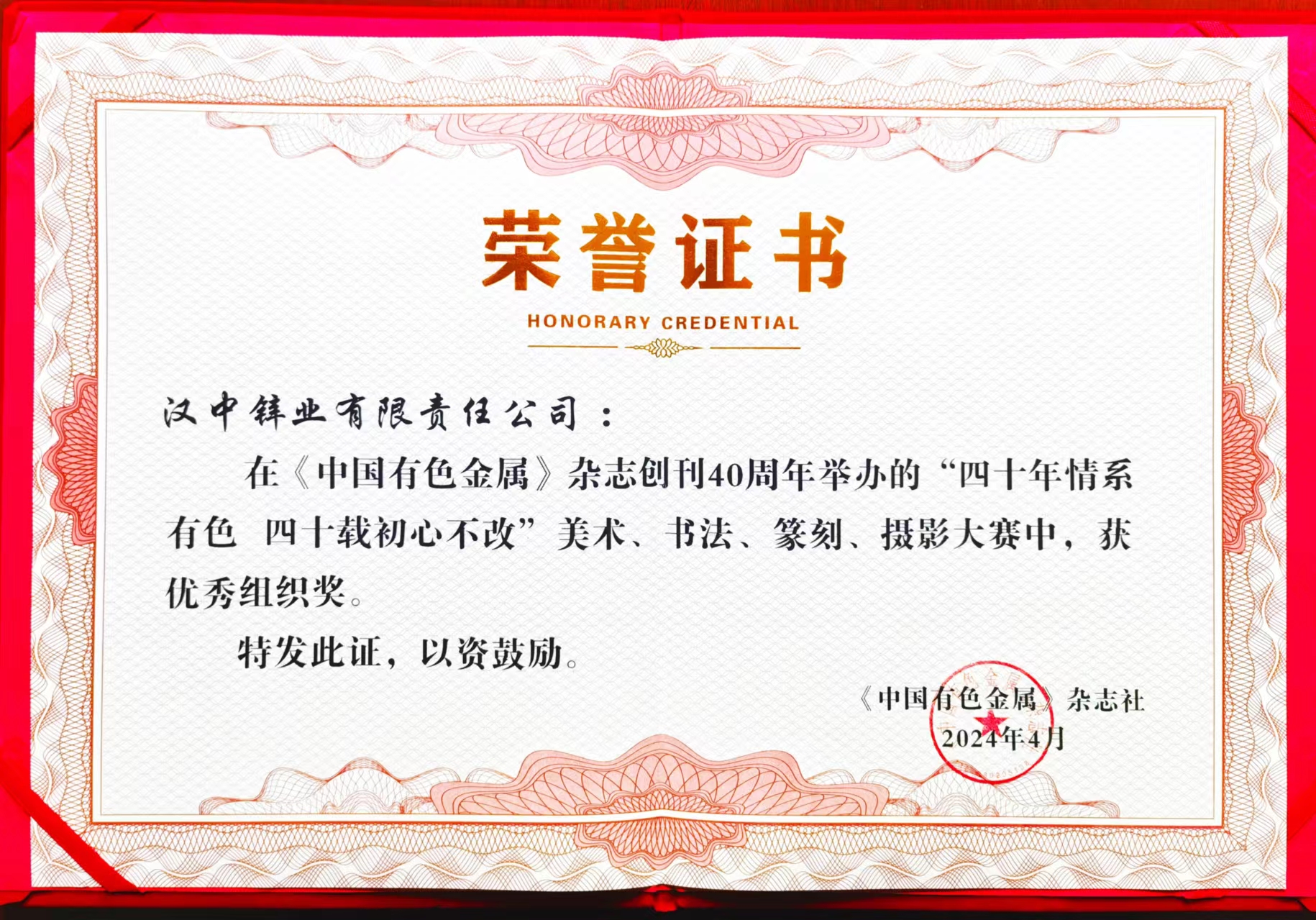 公司在“四十年情系有色 四十載初心不改”美術(shù)、書法、篆刻、攝影大賽中獲得優(yōu)秀組織獎 -